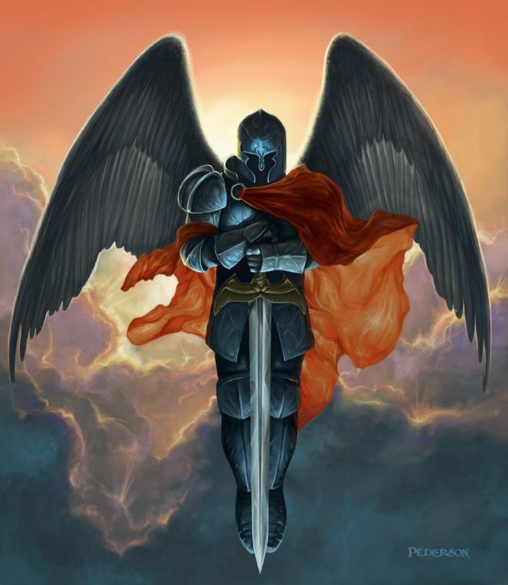 Фэнтези-арт иллюстрация архангела Михаила с шестью крыльями, держащего мечPREMIUM