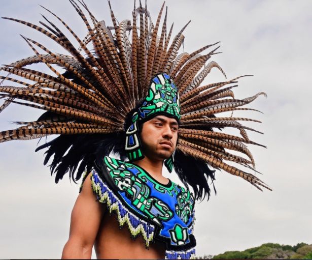 Крупным планом портрет женщины в головном уборе майя из перьев, прикусившей губу, ацтекский концептуальный образ.