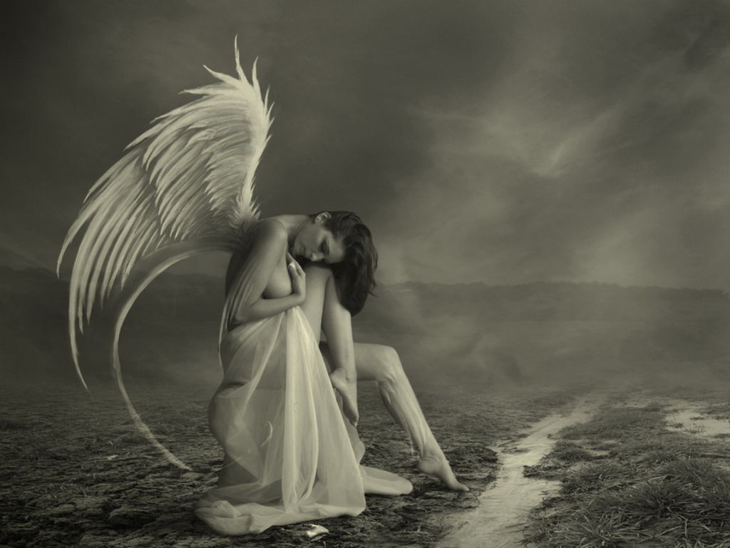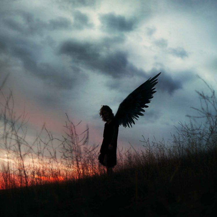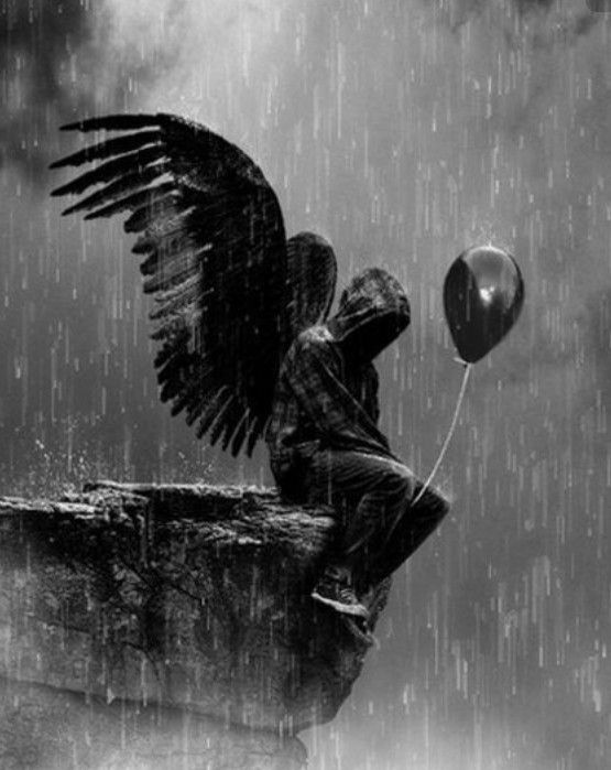Рисунок ангела-девочки с крыльями, летящего в дождливое ночное темное облачное небо.