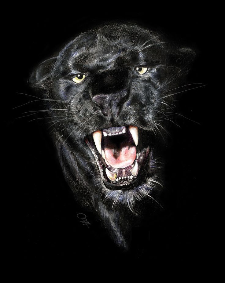 Демонический кот обнажил пасть в сатанинском смехе, красный рот и глаза горят адским пламенем, кот разрывается на черном фонеPREMIUM