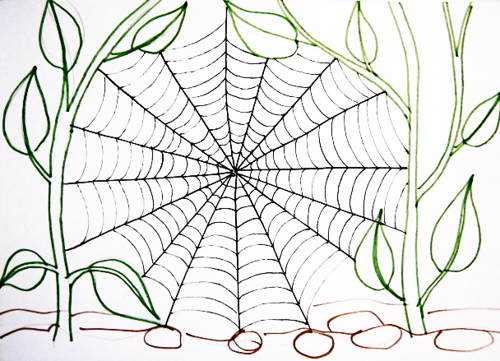 Кому, может, для Хеллоуина или для иной какой готики, а нам для развития рук и глазомера. Паутина представляет собой замечательно красивый и при этом простой радиальный узор. Если понимать, как к делу подойти, то очень приличную паутину может нарисовать и пятилетний ребёнок. В природе, сплетённая пауками, паутина выглядит так:
