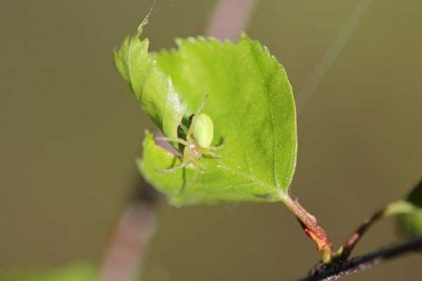 Зеленый паук сидит на листочке.