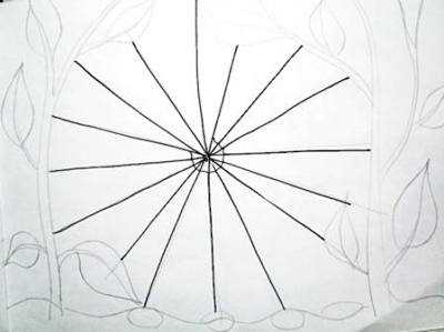 Тут самое важное не терять наш центр и все линии проводить именно из этой точки. Ну вот, подготовительная работа выполнена, теперь надо укрепить будущую паутину, я предлагаю разместить её между двух высоких растений так, чтобы все основные нити вели либо к стеблям, либо к листьям. А те, что направлены вниз, пусть цепляются за … ну, камешки, например.
