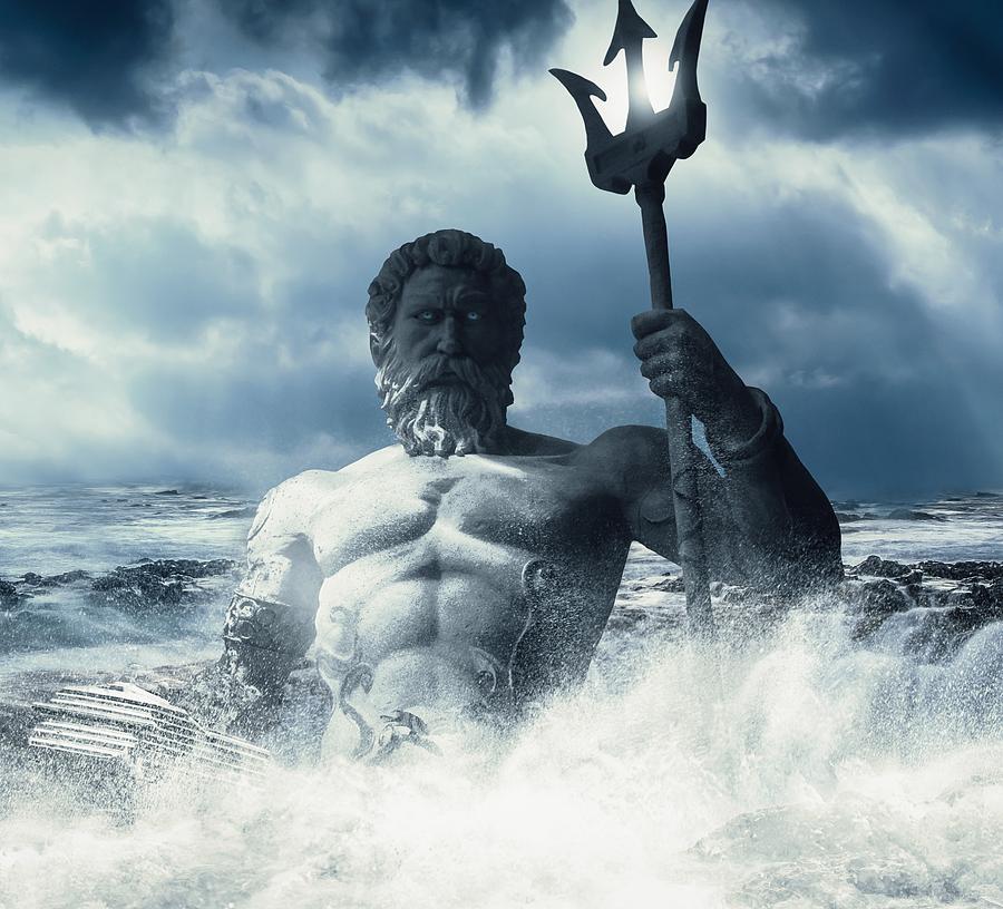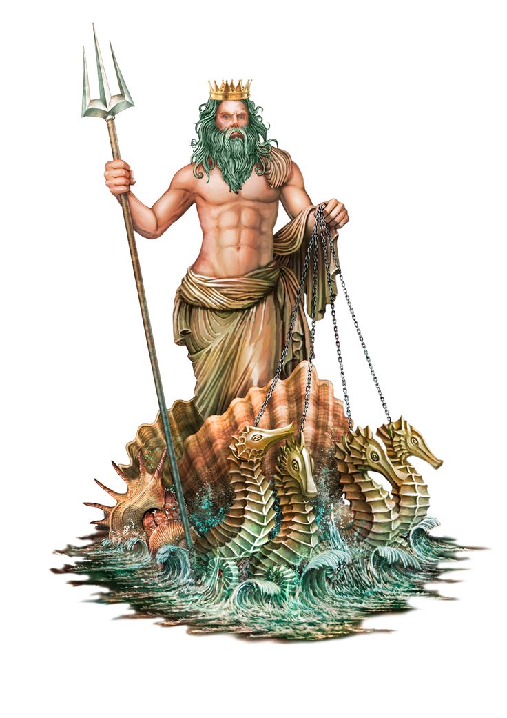 Посейдон — один из главных богов в древней Греции. Он был богом моря, землетрясений и лошадей. Отец Кронос проглотил его при рождении, и именно брат Зевс в конечном итоге заставил отца извергнуть его. Посейдон был печально известен своим вспыльчивым характером, и он также часто имел интимные отношения с нимфами, богинями и смертными. Как следствие, он является отцом многочисленных богов, полубогов и других существ. Трезубец — наиболее известный символ, связанный с Посейдоном, и, кроме всего прочего, его еще можно увидеть на флаге Барбадоса.