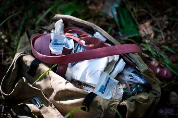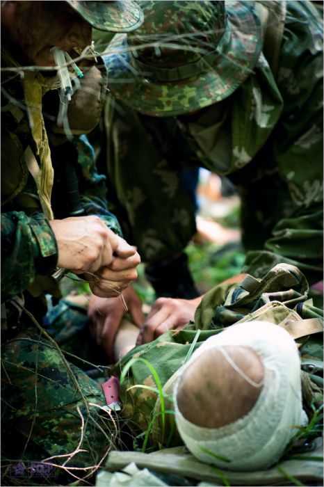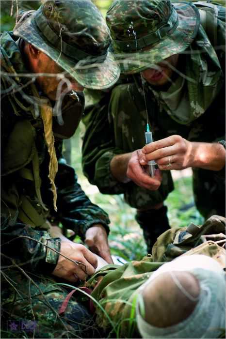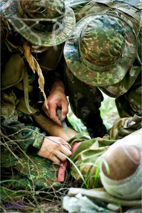 Группа аккуратно пересекла дорогу, имитировала не очень удачное боестолкновение на короткой дистанции – один из сержантов был ранен. Группа приступила к работе с раненым. Имитировались довольно тяжёлые пулевые ранения – в ногу и в глаз. И, до кучи, началась обильная кровопотеря. Раненый, по условиям задачи, сначала был в сознании и мог говорить, но постепенно группа «теряла» его. Перетянув раненую конечность жгутом и перебинтовав голову, приступили к тренировке внутривенной инъекции. Кололи по-настоящему, в шприце была глюкоза из ампулы, а в бою это был бы адреналин или кардиостимуляторы. Вообще говоря, в аптечке санинструктора было много чего, жаль, я не медик, не смог оценить её наполнение по достоинству.