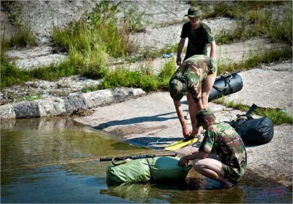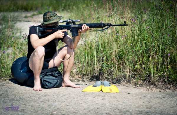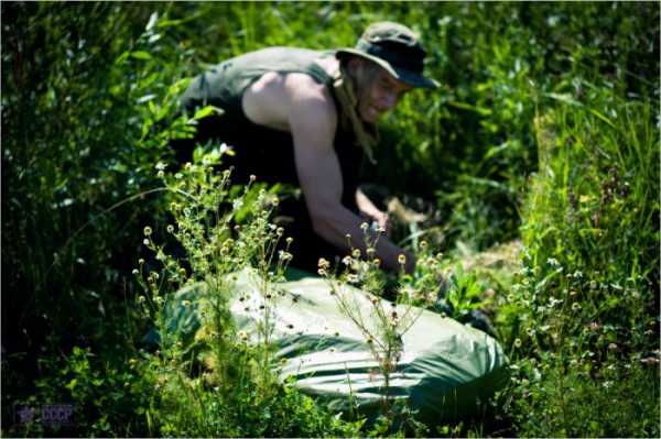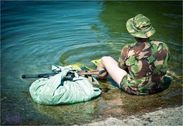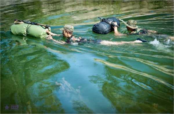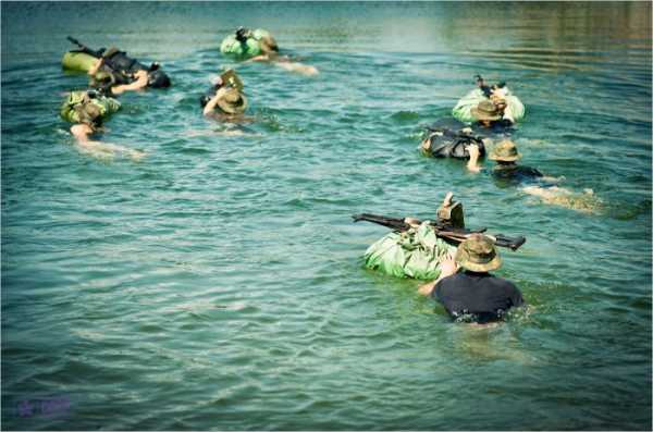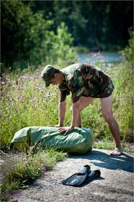 У переправы бойцы с видимым удовольствием разделись, оставшись только в майках и панамках. Майки – чтобы не попали в кадр разного рода особые приметы: татуировки, шрамы, рубцы. Ласты жёлтого цвета в боевой обстановке заменяются на чёрные. А в учебной позволяют быстро найти в водоёме, если те внезапно соскочат с ног. Первые разведчики упаковали своё снаряжение и одежду в гермомешки (один из спецназовцев использовал плащ от ОЗК), приторочили поверх оружие, размотали длинные шнуры с привязанными пластиковыми бутылками-поплавками и отправились «на тот берег». Остальные готовились к переправе или прикрывали её. Первая пара прибыла в назначенную точку и заняла оборону. За ней отправилась вторая, третья и так далее. Протянутый первой парой шнур позволил спецназовцам быстрее подтянуть к берегу остальных, что экономит время и силы плывущих. Наконец, все спецназовцы добрались до конечной точки маршрута. Устали конечно, проголодались. Один из сержантов сообщил, что после 4-5 часов отдыха группа снова может приступить к выполнению задания. Если Родина прикажет.