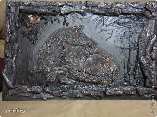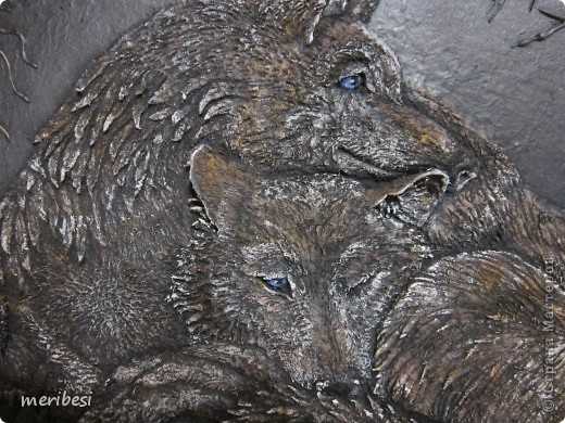 Волки из папье маше лепились прямо на фанере, сразу на эскизе. Лепила я по фото, ведь натуру трудно уговорить позировать:)))) Перед этим целую папку с волками создала, выбирая самую лучшую, до души припавшую!