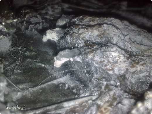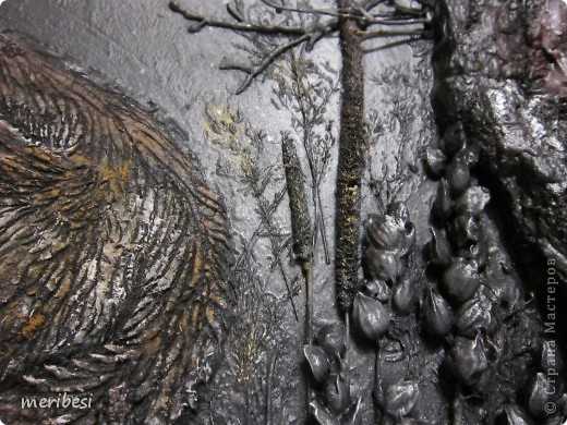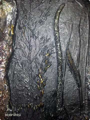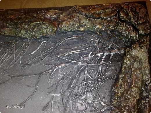 Потом по краю создала рельеф дерева по слою шпатлевки, на нее чуть отступив от края приклеила кору, в середину все веточки и шишечки и травушки. Залила смесью шпатлевки с ПВА всю эту ботанику(колер я забыла добавить и сфотографировать тоже), покрасила в черный из балона – у меня же ночь.