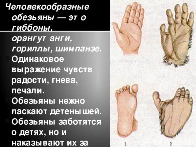 Кисти рук различных приматов. Человеческая кисть (если Вы еще не догадались) – вверху в центре.