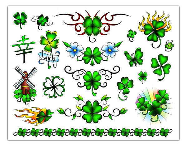 Всем, кто хочет сделать татуировку с изображением четырехлистного клевера, сегодня доступны сотни различных эскизов. Классикой считается рисунок, выполненный в зеленых тонах, а любителям более оригинальных тату понравятся объемные рисунки в черно-зеленых тонах. По размеру тату с клевером редко превосходят традиционную «пачку сигарет», а тем, кто хочет украсить тело более масштабным рисунком, можно выбрать художественную композицию, в основе которой лежит клевер.