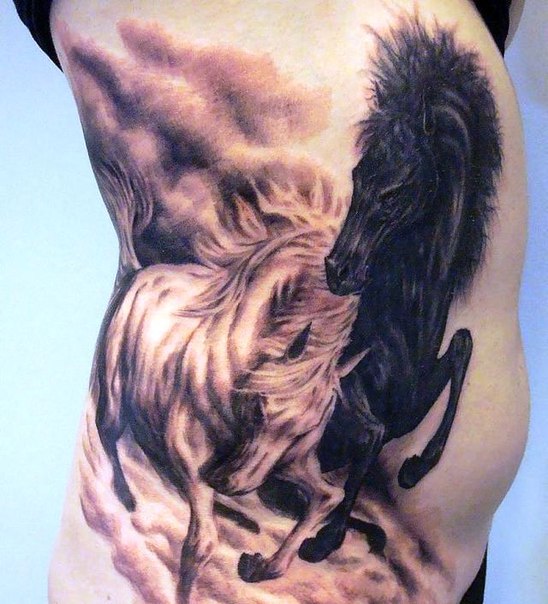 В древней Месопотамии солнечного бога Мардука часто изображали едущим в колеснице, запряженной четверкой лошадей. Конь изначально ассоциировался с агрессивным мужским началом, физической силой и выносливостью, солнечной энергией, дарующей жизнь всему на земле. Позже лошадь стала женским лунным символом, что стало одной из причин, по которым этот образ и более популярным в женских татуировках.