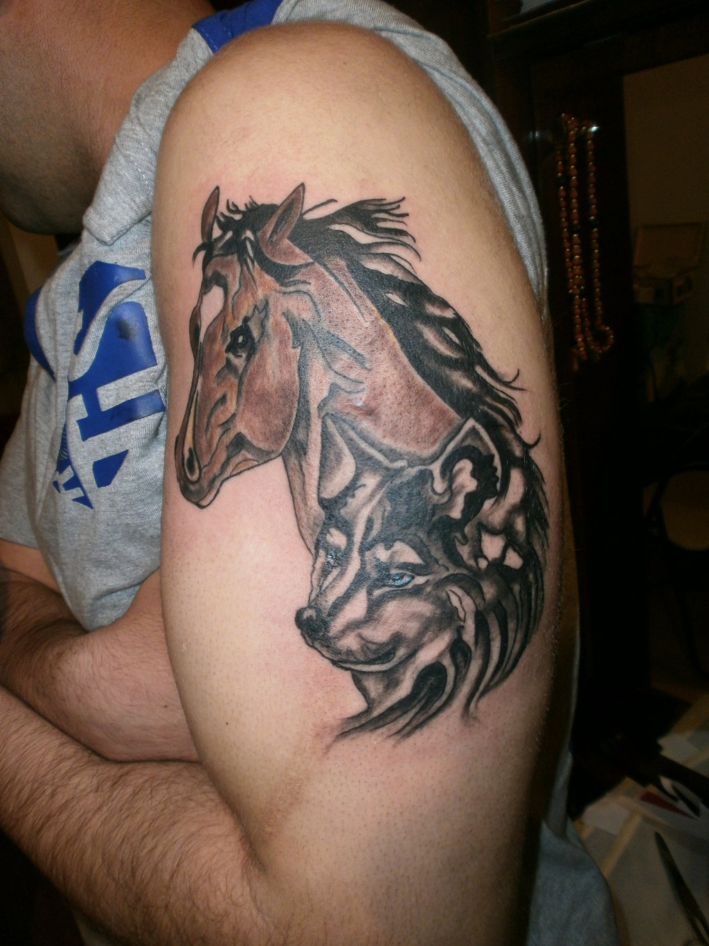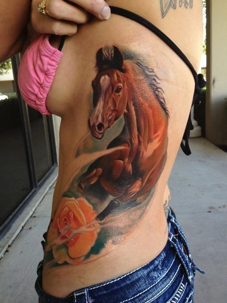 Это довольно сложная татуировка, которую должен делать хороший тату-мастер.Он сделан так, как будто лошадь является частью тела, и как будто она будет двигаться по коже.