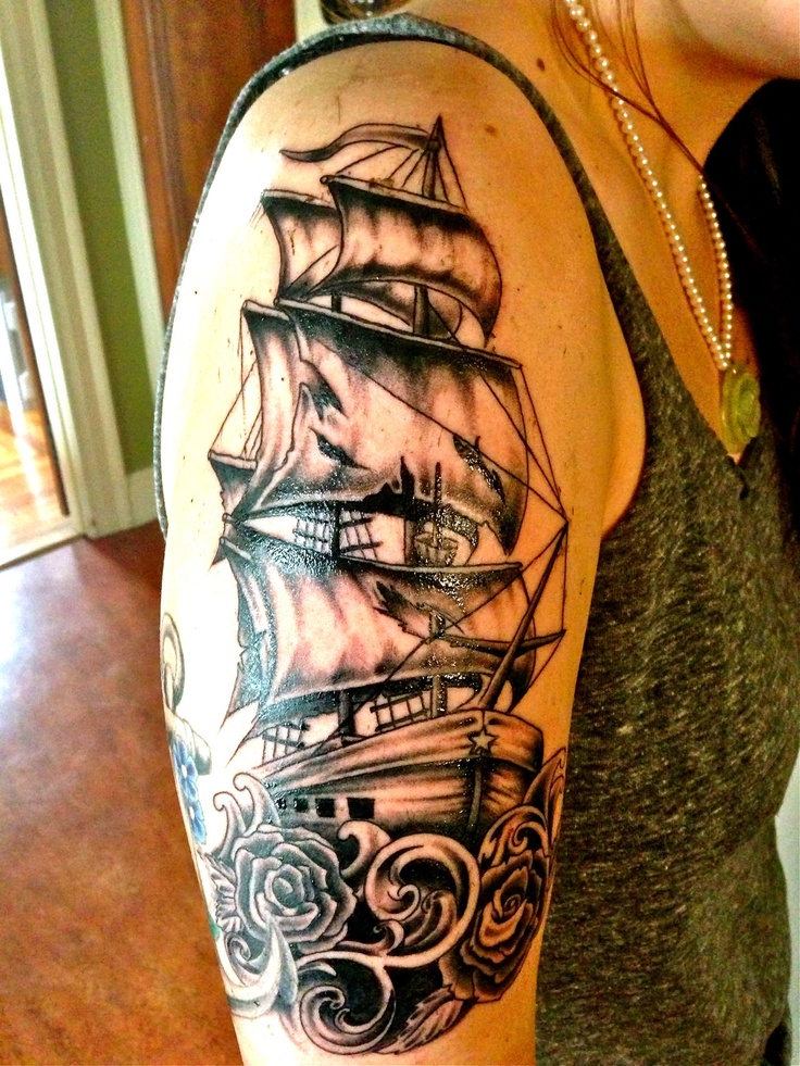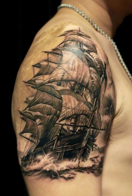 Татуировки с кораблями выгодно смотрятся как в монохроме, так и в ярких цветах.![]()