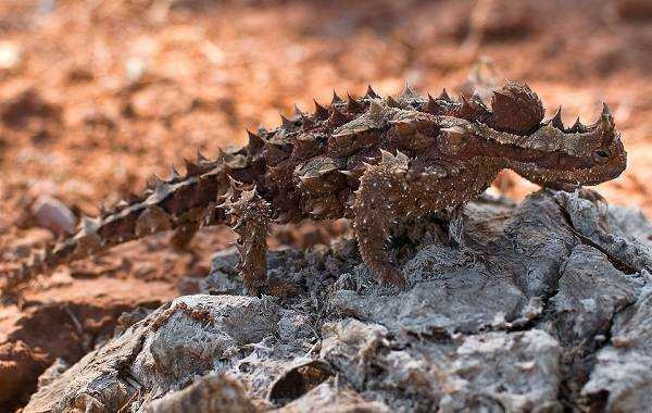 Это австралийское пресмыкающееся, которое встречается в пустынях. Молох – хороший маскировщик. Его коричневое или песочное тело практически незаметно в сухом австралийском климате. В зависимости от погоды, он может менять окрас. Муравей – основная пища данного вида ящерицы.