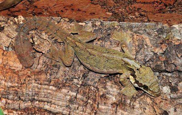 Лучший маскировщик среди рептилий! Кстати, он также, как и пантеровый хамелеон, водится на острове Мадагаскар. Если обратить внимание на этот вид ящерицы на фото, где есть листва, то едва ли получится его разглядеть. Он практически полностью сливается со средой, поэтому некоторые называют его «сатанинским гекконом».