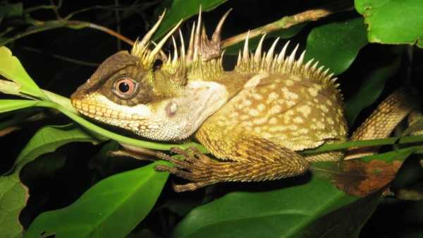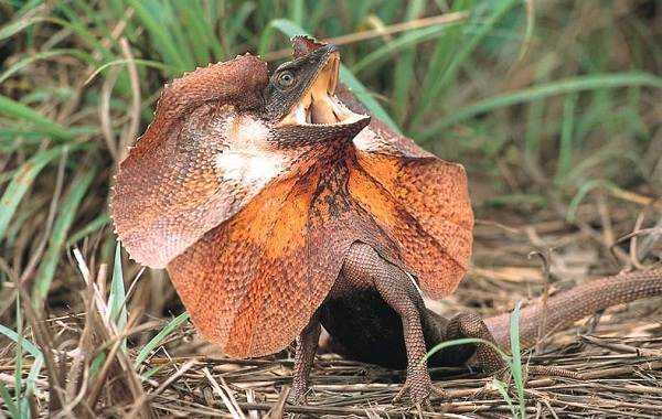 Данное зрелище может напугать не только хищника, но даже человека. Водится этот необычный зверь на острове Новая Гвинея. Чаще всего, на серо-коричневом или ярко-красном теле особи имеются светлые или темные пятна. Кроме насекомых, плащеносная ящерица очень любит фрукты.