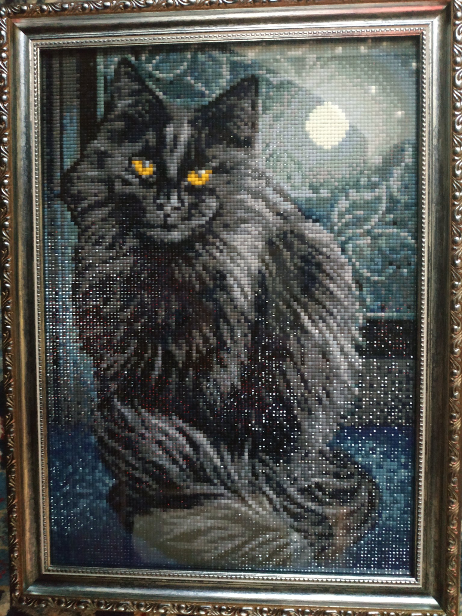 Мастерицы могут украсить комнату масштабным полотном с играющими котятами. Оформленная вышивка в багет добавит произведению солидности, поможет интегрировать его в классический интерьер.