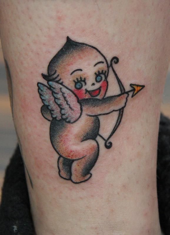 Нередко на тату милый ангелочек улыбается, и целиться в кого-то.