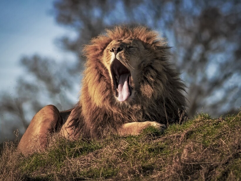 Löwe müde nach erfolgreicher Jagd, Mund offen, Augen geschlossen