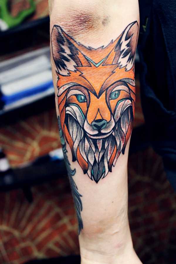 Еще один интересный стиль, в котором оригинально будет выглядеть тату лиса — геометрия. Он примечателен четкими прямыми линиями, лиса выполняется из геометрических фигур. Такие работы тоже вполне могут быть как цветными, так и черно-белыми. Часто встречаются маленькие тату лиса на запястье, щиколотке или шее, состоящие всего из нескольких фигур.