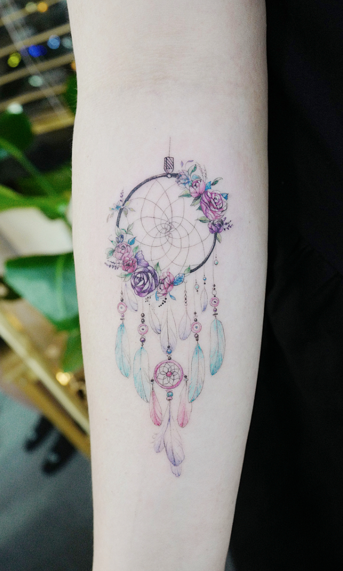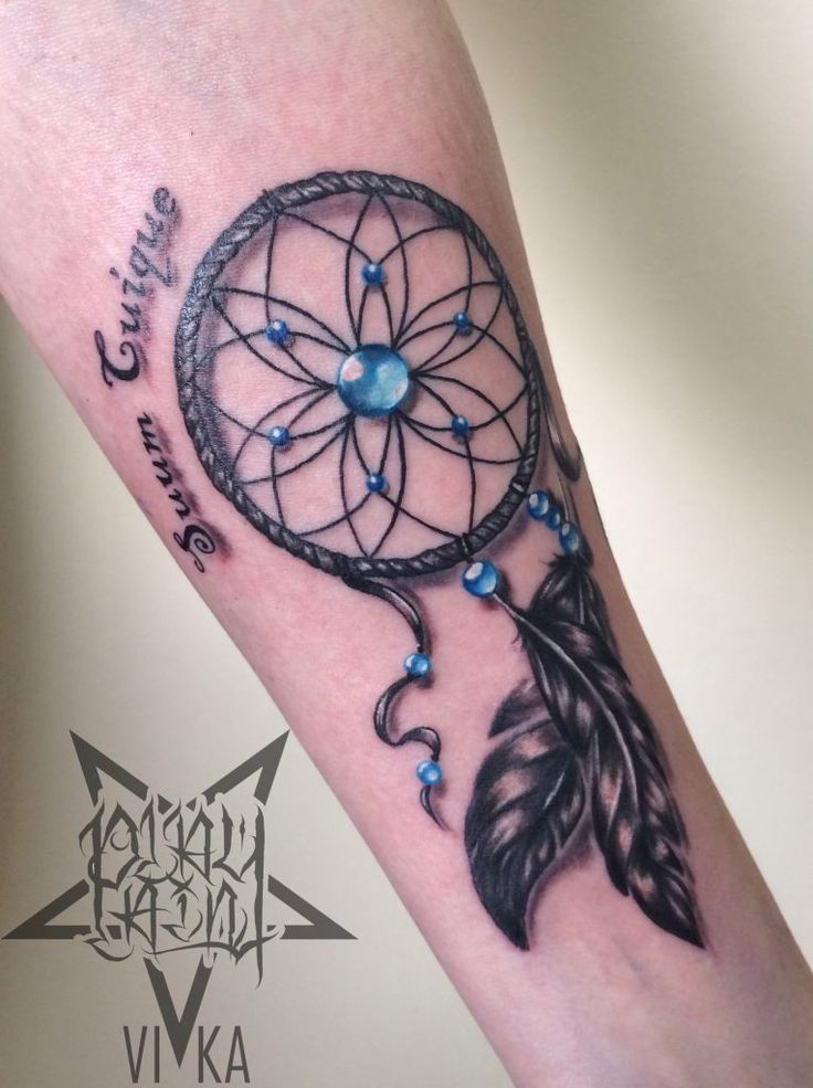 Ловец снов — растущая тенденция среди татуировок на запястье для представителей богемы. Эта тщательно продуманная татуировка точно отражает обруч и нити посередине, имитирующие лотос, в комплекте с перьями, свисающими на веревках из бисера под предметом.