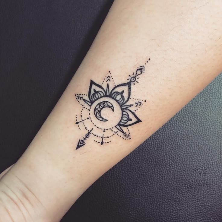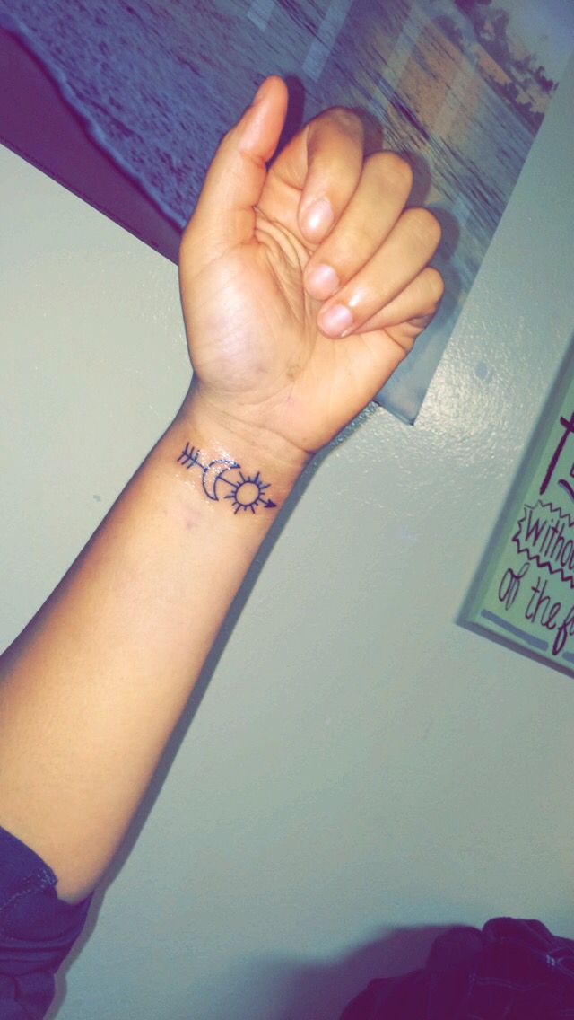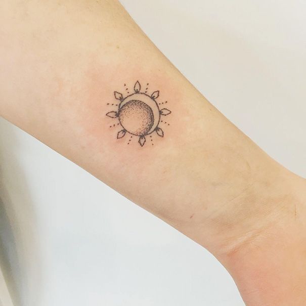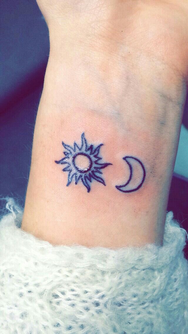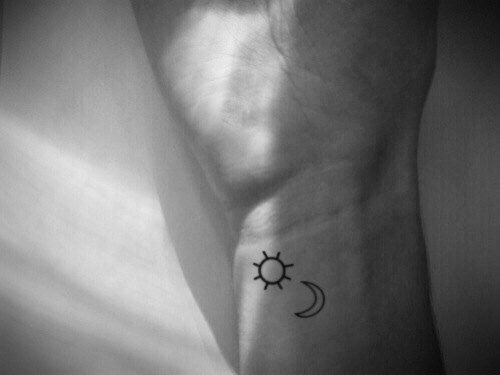 Если вы не хотите богато украшенную или украшенную татуировку, это не означает, что вы должны полностью избегать татуировки луны/солнца. Сделанная для татуировки на запястье, дизайн варьируется с каждой стороны. В то время как луна полая на одном запястье, она заполнена черными чернилами на другом. Тот же узор соответствует солнцу, сочетая залитое солнце с открытым полумесяцем.
