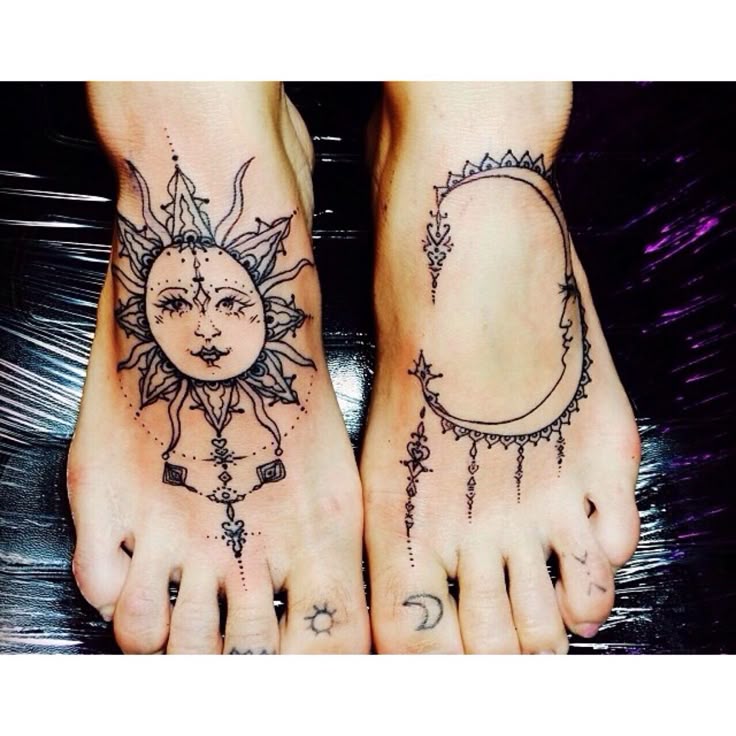 Эта татуировка разделена на две части и украшает каждую лодыжку владельца. Благодаря искусному и креативному дизайну солнце смотрит широко открытыми глазами, в то время как солнце держит глаза закрытыми. Оба имеют украшенные драгоценными камнями капли из углов, которые они естественно включают, например, конец полумесяца и кончики солнечных лучей.