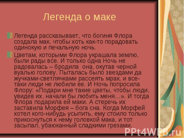 Растение, из которого добывают опиумный дурман, овеяно множеством сказаний и поверий. Легенды о происхождения мака гласят, что боги создали его из магического жезла, дарующего сон. Растение способно привлекать сновидения и дарует спокойные сны тем, кто употребит его зерна.