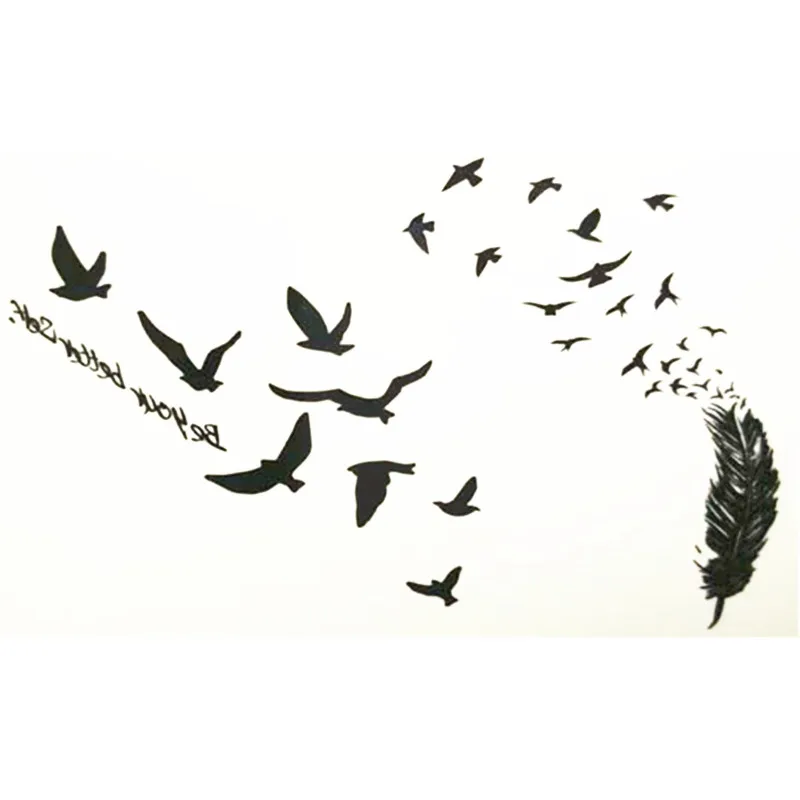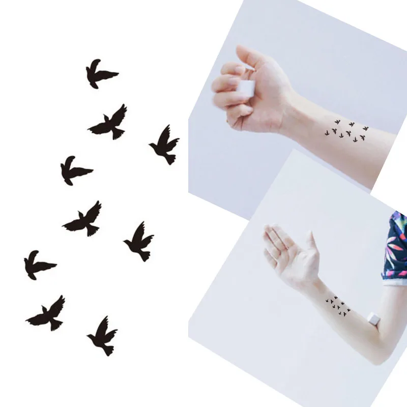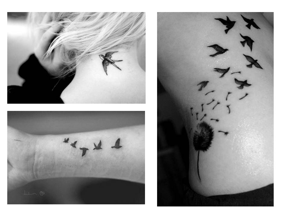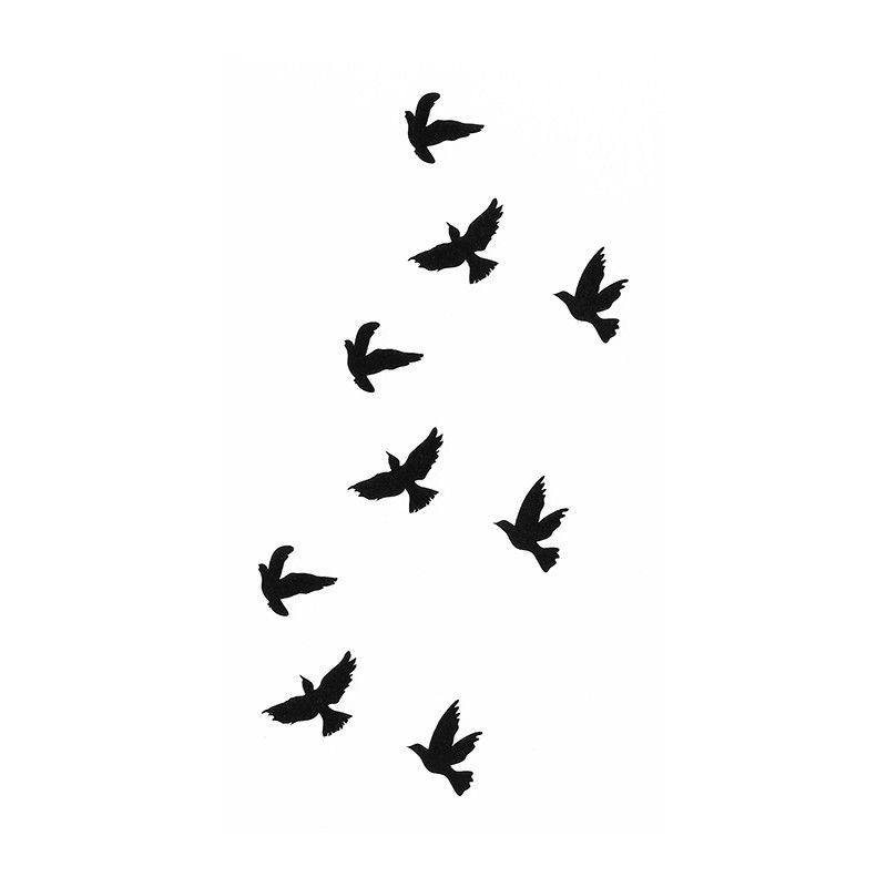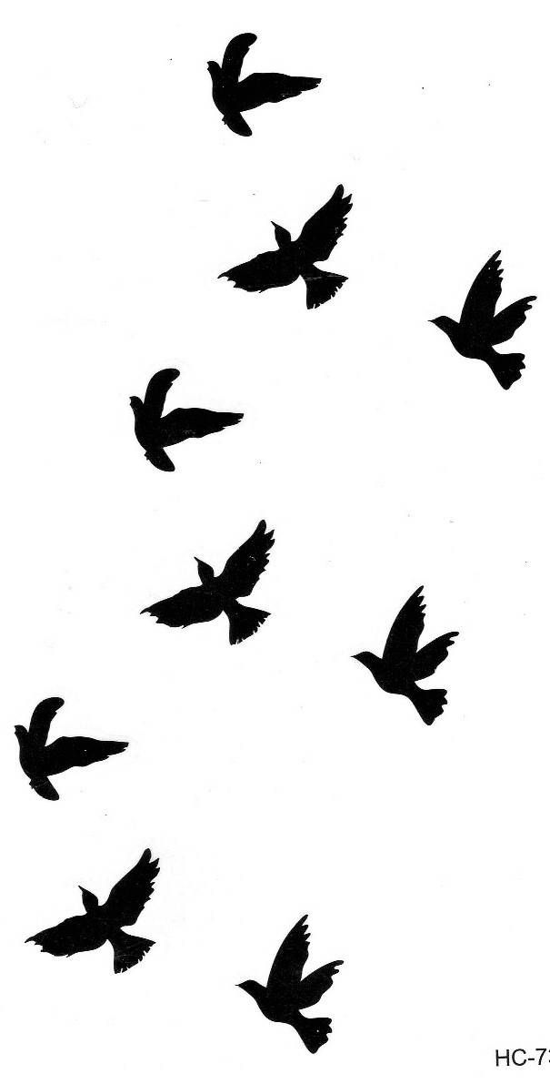 Птицы всегда были символом свободы, для птиц нет преград для пути, они не подвержены земному притяжению и могут отправится, куда им вздумается. Птички ассоциируются с перемещениями и путешествиями, ведь некоторые виды целой стаей проделывают каждый год огромный путь в южные страны, чтобы перезимовать. Тату стая птичек поможет украсить судьбу путешественников и любителей приключений. Этот рисунок говорит не просто о свободе в перемещениях в пространстве, но и о свободе выбора своего жизненного пути. Это возможность не просто мечтать, но и следовать своей мечте и добиваться поставленных целей не смотря на трудности и препятствия. Чтобы изобразить стаю, обычно делают тату маленьких птичек одного цвета, чаще всего черного с полной заливкой.
