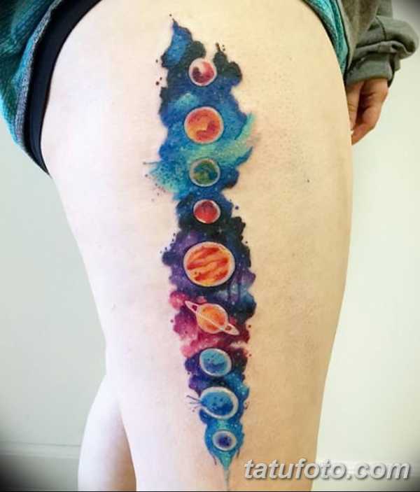 Татуировки на космическую тематику становятся все более популярными. Они несут в себе изюминку, некую загадочность, что-то неизведанное. Человек, который выбирает тату парад планет это личность с развитой фантазией и хорошо работающим воображением. Это тату выражает что-то масштабное и обладает значимостью гармонии с собой и миром. Татуировка указывает на сильную взаимосвязь с окружающей средой.Планеты на теле человека несут в себе глобальные идеи возрождения мира. Космос соотносится со спокойствием, мудростью и гармонией. Такая татуировка на теле свидетельствует о стремлении к гармонии с миром, с самим собой.