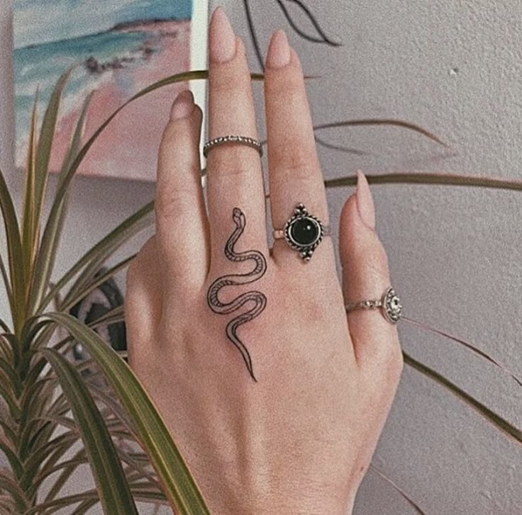 Змеи — прекрасный выбор для татуировок на пальцах, которые в последние годы становятся все более популярными. На боковой или верхней части пальца маленькая татуировка змеи черными чернилами выглядит чудесно и нежно.