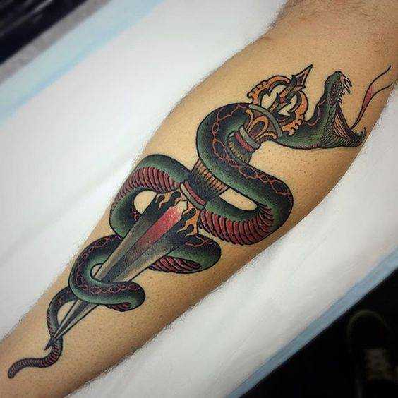 Змея с львиной головой – сила, удачливость, ловкость. Тату пресмыкающегося, ползущего по холодному оружию, говорит о том, что человек перенес тяжелое испытание либо болезнь.