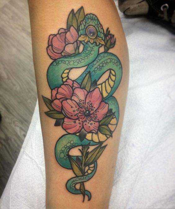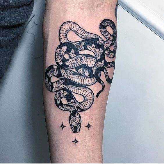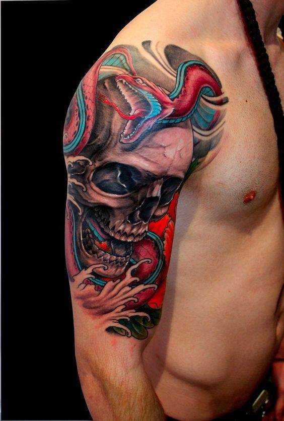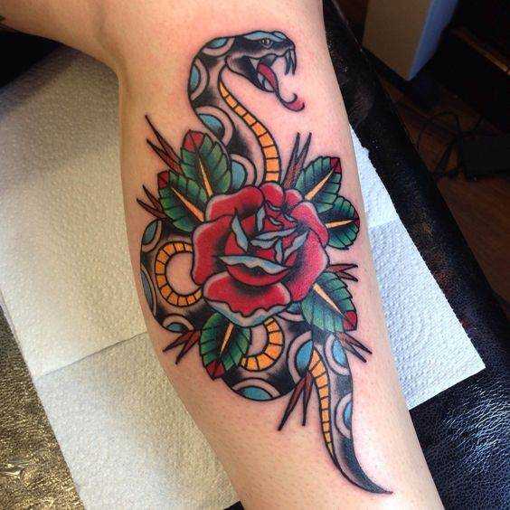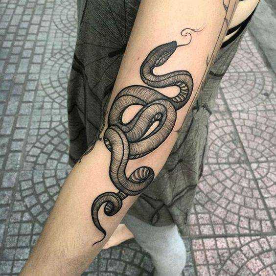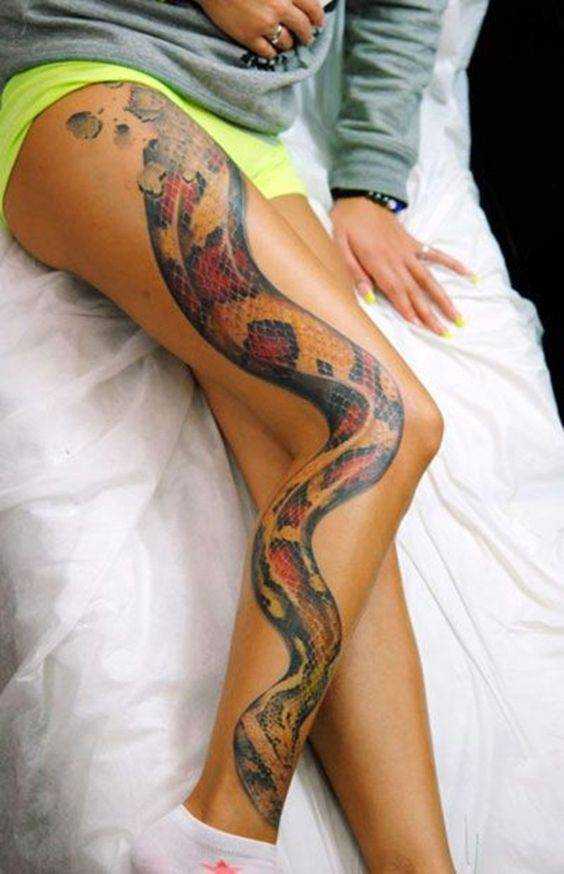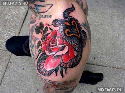 Впечатляюще смотрится татуировка пресмыкающегося на плече, груди, предплечье, когда змеиная голова прорывается через кожу и будто вылазит из тела. Также дозволено запечатлеть хищницу, свернувшуюся в кольца.