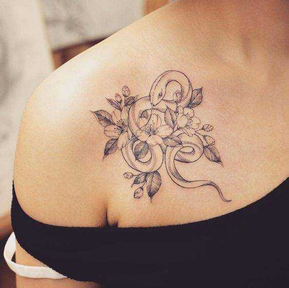 Девушки зачастую выбирают блестящие изображения суперкомпактных либо средних размеров. Прекрасно выглядят тату змеи на плече либо лопатке, когда пластичная хищница извивается вокруг цветка. Изысканный рисунок выигрышно подчеркнет линию женской ножки. Специальной загадочности и оригинальности добавит изображение хищницы в виде браслета.