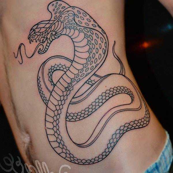 Мужчины для татуировки в основном выбирают изображение атакующей кобры, потому что гремучая нападающая змея ассоциируется с силой и бесстрашием. В данном случае лучше сконцентрировать внимание на голове хищницы – расправленном капюшоне, острых клыках, ясно выраженных чешуйках.