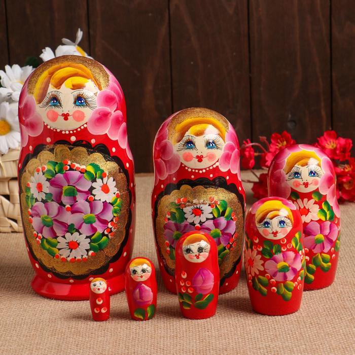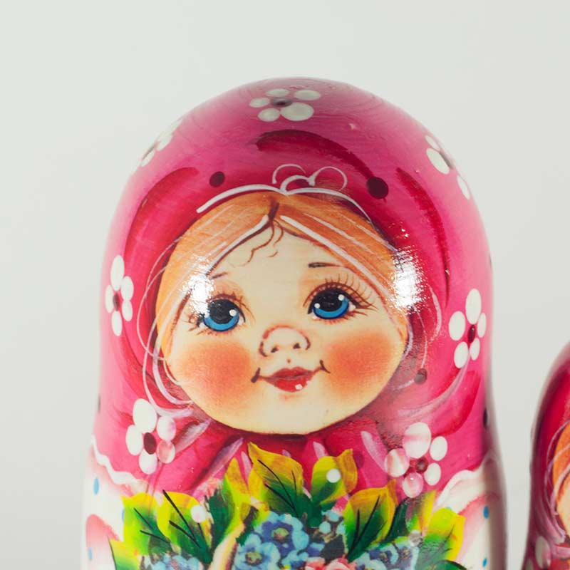 3)На переднике фигурки обычно изображаются пышные полевые цветы, ведь матрешка изображает крестьянскую, а не городскую девушку.