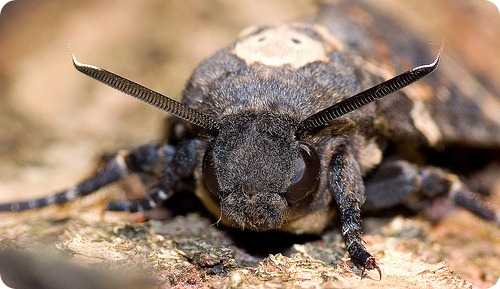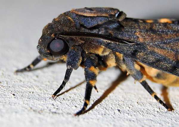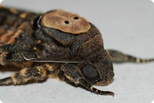 Макроснимок бабочки бражника “Мёртвая голова” – отчетливо видны фасеточные глаза насекомого и короткие толстые усики. Автор фото: f.scatton.