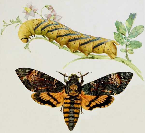 Бабочка «Мертвая голова» имеет полный цикл превращения, состоящий из четырех фаз: