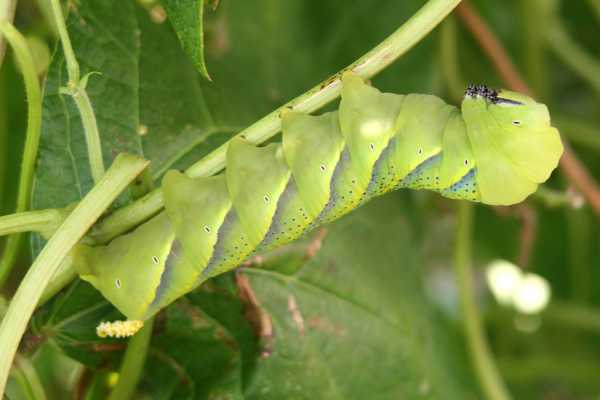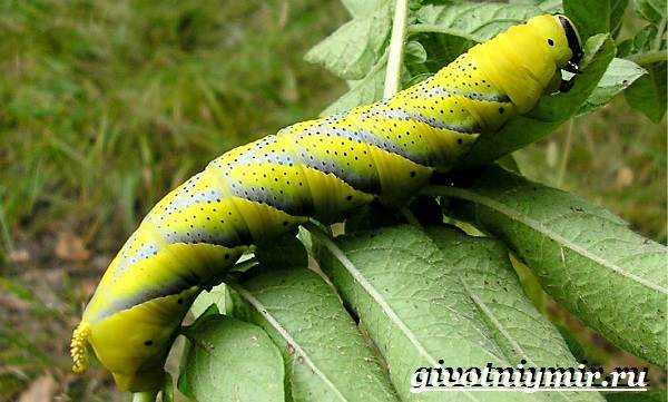 Появление личинок на свет происходит в июле, и живут они примерно до сентября. Гусеницы у «Мертвой головы» вырастают крупные (до пятнадцати сантиметров в длину) и, как правило, имеют красивую воинствующую окраску. На последнем сегменте тела находится отросток в виде дважды согнутого рога. Окраска у личинки очаровательная: от лимонно – желтого, канареечного цвета до коричневатого оттенка, с синими и зелеными разводами.