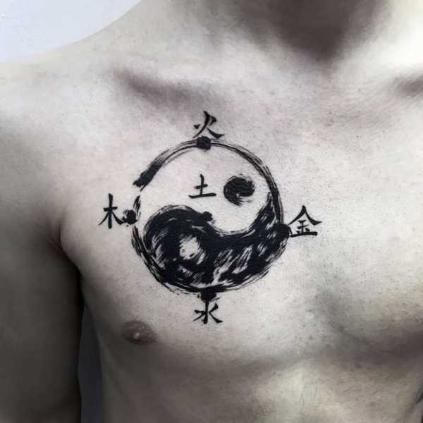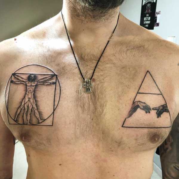 Некоторые мужчины предпочитают набивать небольшую татуировку на одной стороне груди, в то время как другие носят на грудной клетке большое художественное изображение.