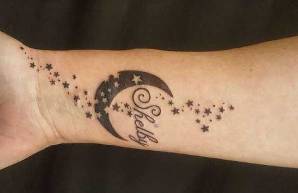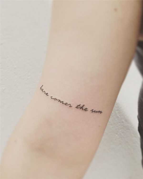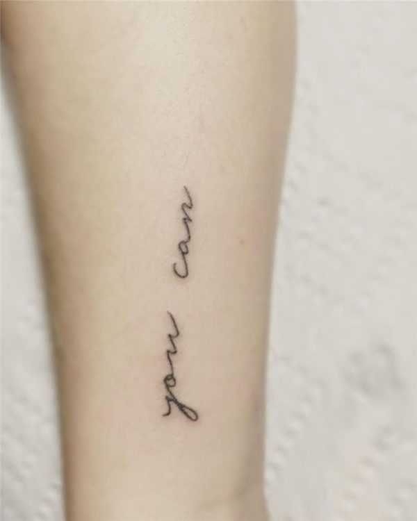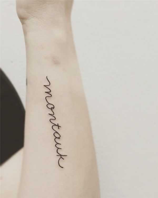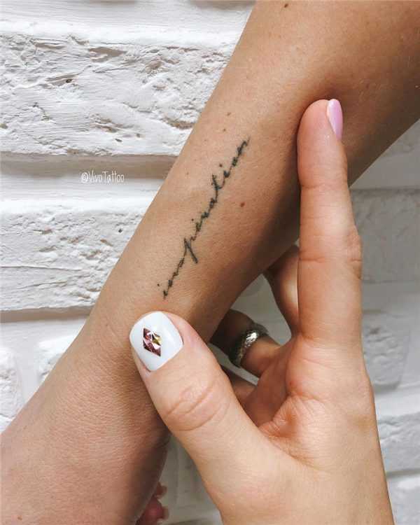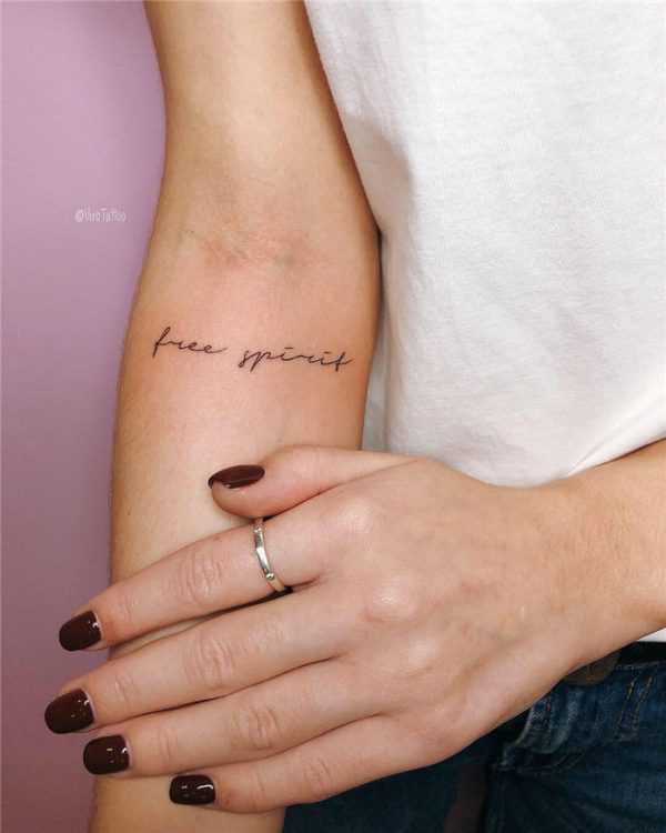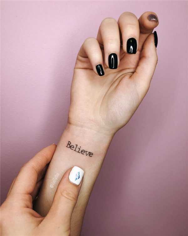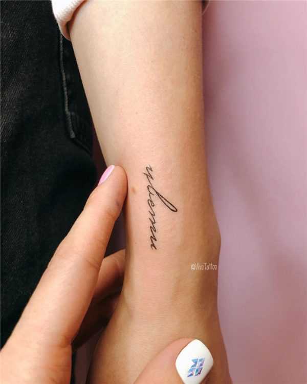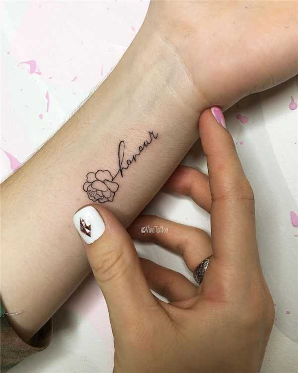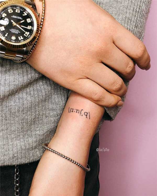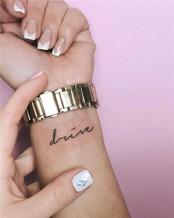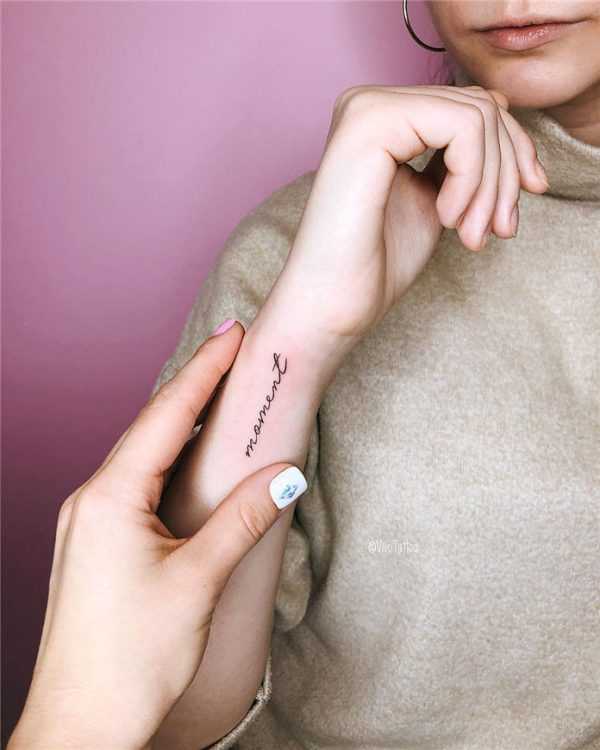 Изящно маленькая татуировка надпись будет смотреться на запястье. Очень важно подобрать для надписи подходящий шрифт, в зависимости от которого тату будет приобретать разный стиль и дизайн. Модно делать любые надписи на руке, от имени до знаковых или символических выражений.