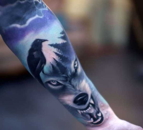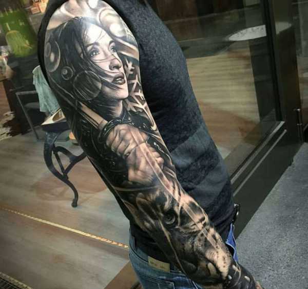 - крупные и сложные композиции, где присутствуют персонажи, животные, птицы, сочетание нескольких сразу, гармонично будут смотреться на просторном «поле» — в качестве рукава, на плече и предплечье;