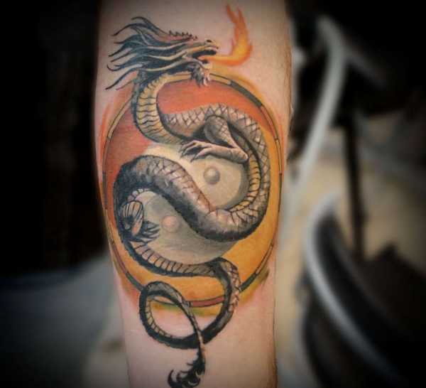 Восточный дракон. Эта мужская татуировка, которая символизирует великую добрую волю, мудрость, силу и союз противоположностей. Считается, что изображение дракона приносит удачу своему владельцу.