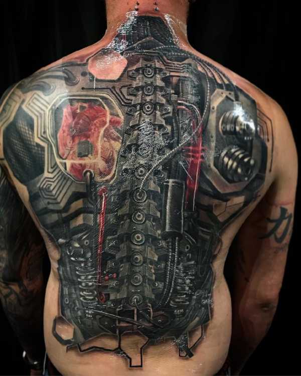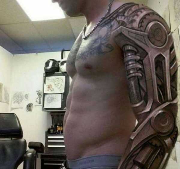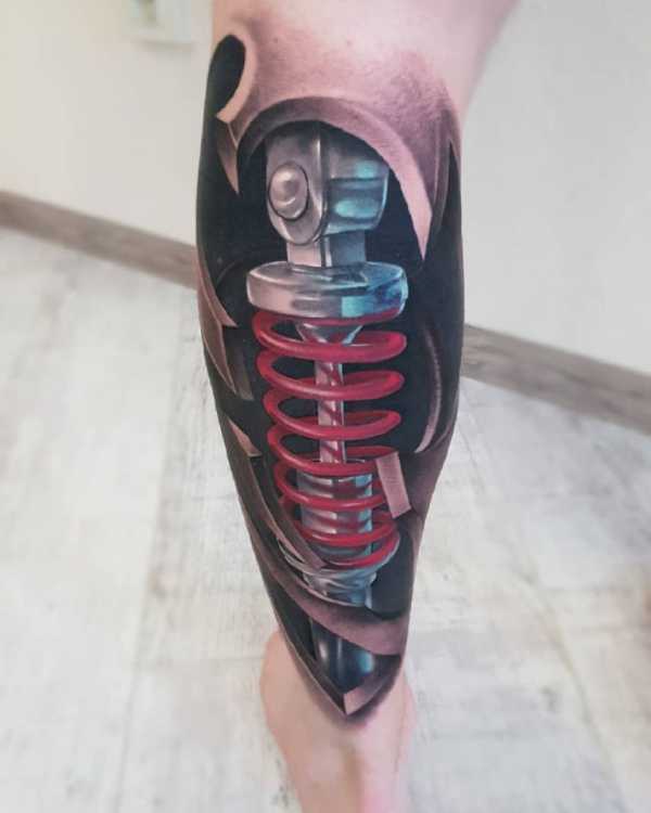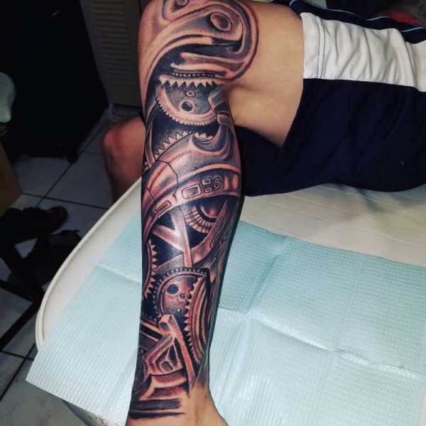 Самой оригинальной татуировкой на ноге является биомеханика. Этот стиль приходится по нраву многим парням, поскольку подразумевает изображение деталей машин и различных механизмов под кожей, что смотрится очень эффектно. Ниже вы можете в этом убедиться.