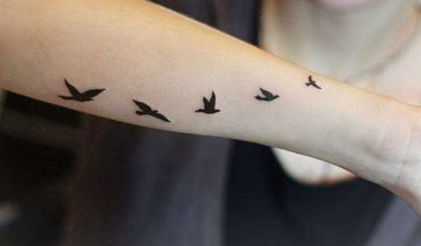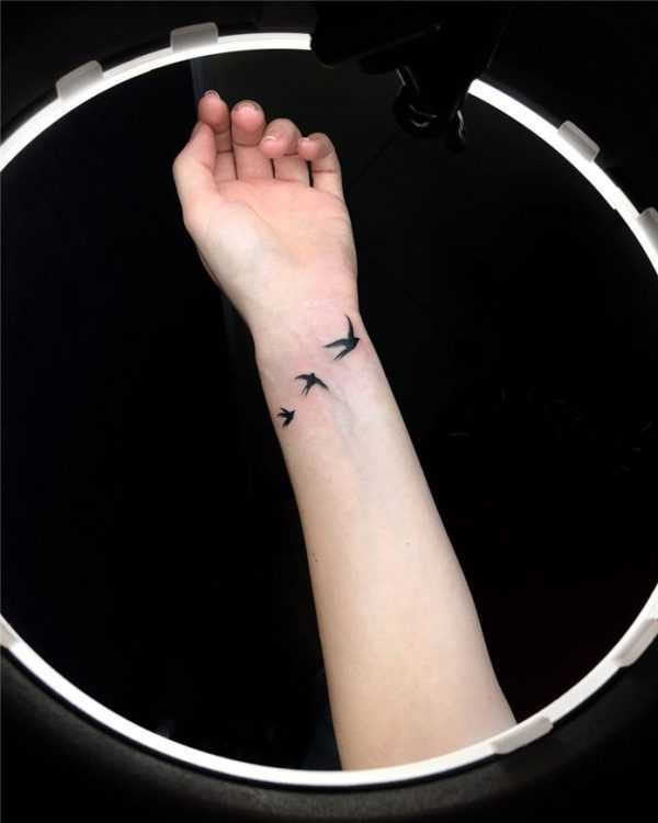 Отдельно хочется отметить и еще один вид тату, где изображены множество маленьких летящих птичек. Как правило, они набиваются черным цветом в виде силуэтов и символизируют свободу, полет мыслей, фантазию, мечты и стремления к ним. Пожалуй, это действительно очень светлый и чистый рисунок, который обязательно приведет свою обладательницу к мечте.
