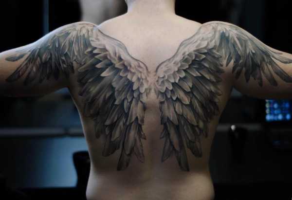 Крылья ангела – одна из самых популярных татуировок на спине у мужчин. Тату представляет собой крылья на лопатках, которые часто изображают с ангелом или большим крестом вдоль позвоночника. Крылья, для большей реалистичности, можно изобразить в технике 3D, а также включить в них племенные узоры или нарисовать их в акварельном стиле для придания большей оригинальности.
