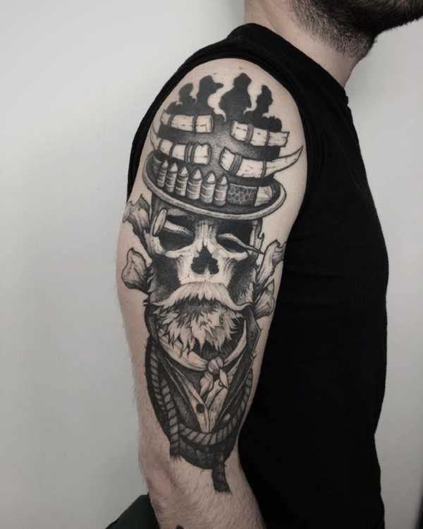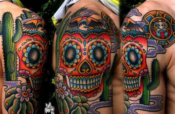 Изображение черепа. Сегодня, череп является одним из самых популярных символов татуировки для мужчин. К тому же, они довольно универсальны: с легкостью дополняются цветами, языками пламени и прочими деталями, в зависимости от значения, вкладываемого в татушку.
