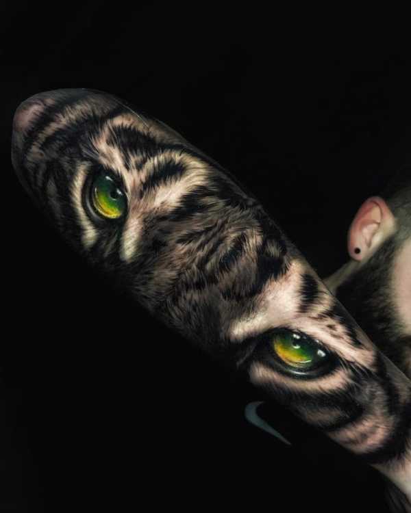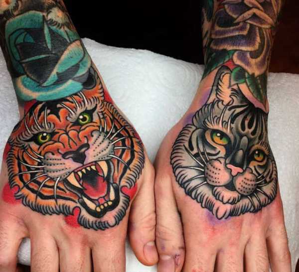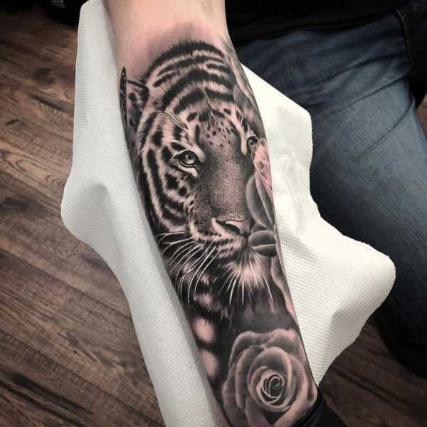 Тигр. В древние времена люди связывали тигров с силой, храбростью и властью. Соответственно, мужские тату воплощают эти характеристики животного во владельце рисунка.