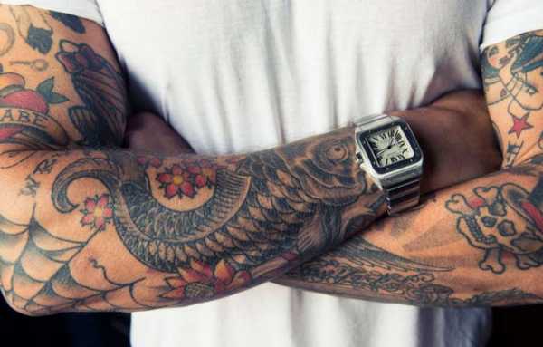 Рыбы кои. Эти существа часто встречаются в мужских татуировках. Эскизы татуировки рыб кои связаны с удачей, энергией, силой и любовью. В китайской культуре они символизируют приверженность мечте.