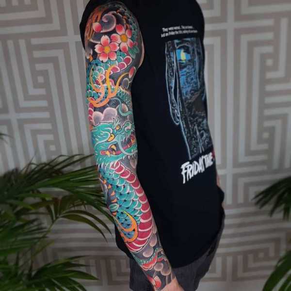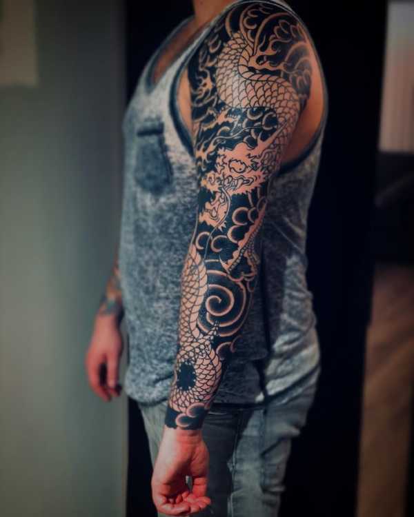 Еще одна крутая идея для наколки рукава – изображение огромного дракона. Дракон – это впечатляющий образ, и это одна из тех татуировок, которая всегда будет привлекать к себе внимание, где бы вы ни находились. Лучше всего рисунок выглядит в ярких цветах: они удачно подчеркивают угрожающий вид мифического существа.